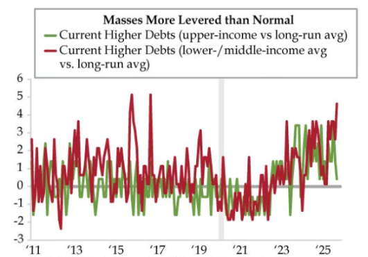 Household debt and leverage are near multi-year highs, per the Federal Reserve.