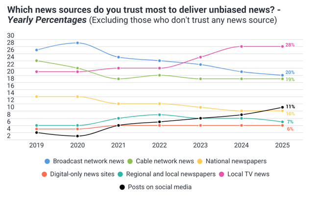 Which news sources do you trust most to deliver unbiased news? Yearly percentages excluding those who don’t trust any news sources.