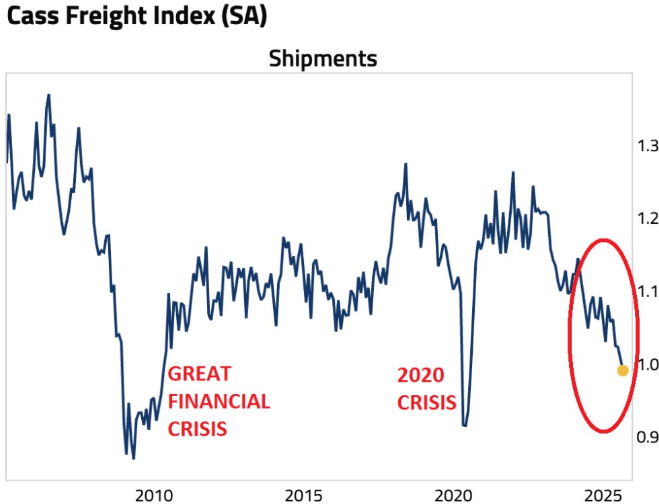 Insight: The Cass Freight Index (shipments) has fallen and in some months hit lows not seen since pandemic disruptions; freight volumes are an early indicator of trade and manufacturing demand. Cass Information Systems+1